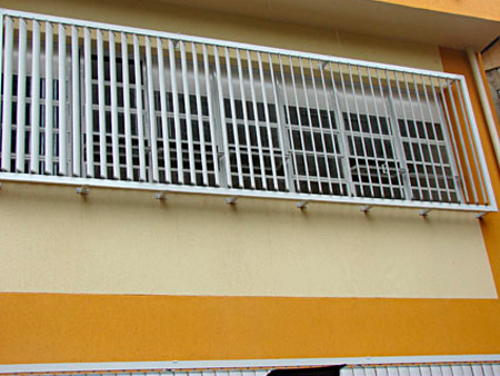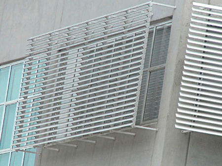 Brise tipo 84 C, fabricado em aço galvanizado, alumínio ou zinca lume com pintura eletrostática na cor a definir. Constituído por doze lâminas por metro quadrado, horizontais à 45°, medindo 3000 mm de comprimento cada lâmina, suporte de sustentação das lâminas com 1480 mm de espaçamento.